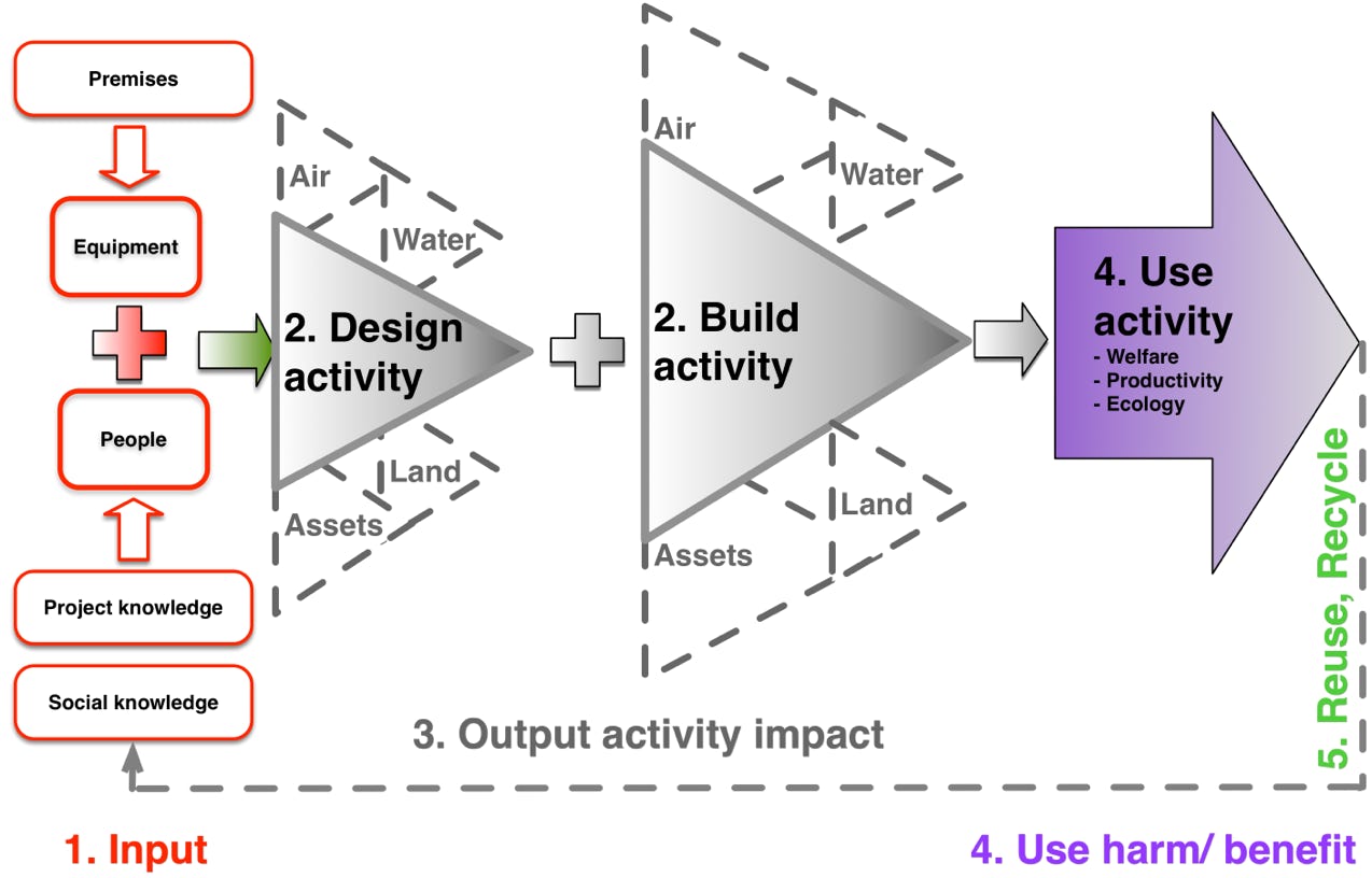 1. Input; 2. Activities; 3. Output impact; 4. Use harm/benefit and 5. Reuse, Recycle.